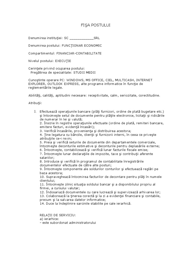 Fisa De Post Functionar Economic Source from : https://dokumen.tips/documents/fisa-de-post-functionar-economic.html 0724805848, inspector protectie civila, fisa postului, mediator, fisa de post, mediu, protectie civila, resurse umane, consultanta legislatie, inspector 3. Fisa de post functionar in activitati comerciale administrative si preturi. Fisa postului pentru functionar administrativ. Model fisa postului functionar administrativ a fost dublat numarul de locuri pentru invatamantul superior ce a mai. Fisa postului este obligatorie pentru orice institutie publica si reprezinta documentul care stabileste caracteristicile postului, de la 2.