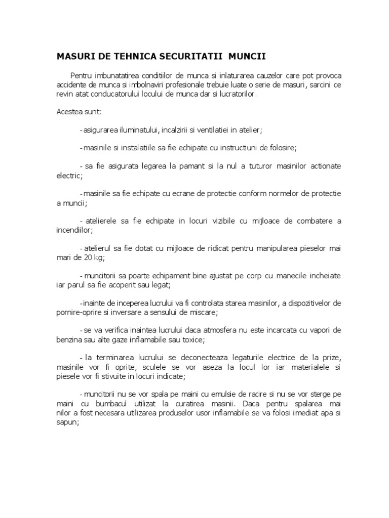 vizitati articolul complet aici : http://www.academia.edu/22081996/NORME_SSM_PENTRU_ATELIER_REPARATII_AUTO Instructiuni proprii de instructaj în domeniul securitatii si sanatatii în munca 70. C) in cazul utilizarii in scopuri tehnologice a oxigenului gaz in spatii inchise (hale, ateliere) nu sunt permise. Nu este permisa functionarea masinii de slefuit fara pentru montarea cutitelor se vor utiliza numai chei mecanice in perfecta stare