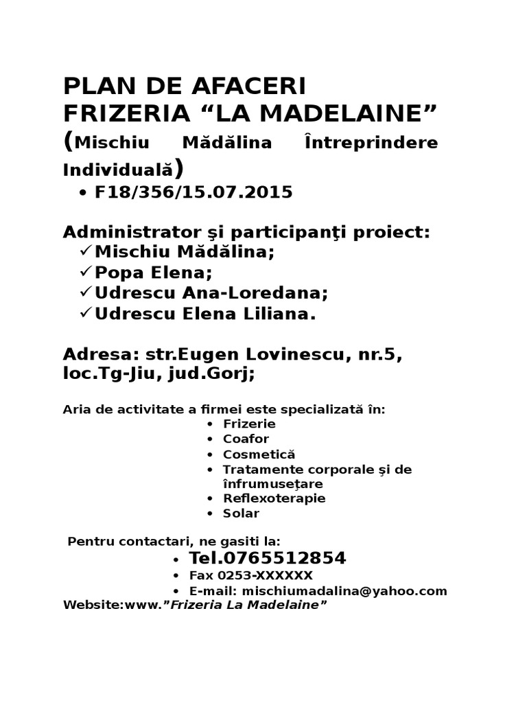 Probabil nu veţi avea prea mult loc de negocieri privind dobânda, dar. Salonul de infrumusetare este situat pe calea mosilor, cu clientela formata de 11 ani si personal cu experienta. Plan de afaceri planul de afaceri pentru înfiinţarea centrului de înfrumuseţare şi întreţinere corporală „mata hari pentru sc abc consulting srl 1 cei mai importanţi concurenţi identificaţi în urma studiului de piaţă sunt: